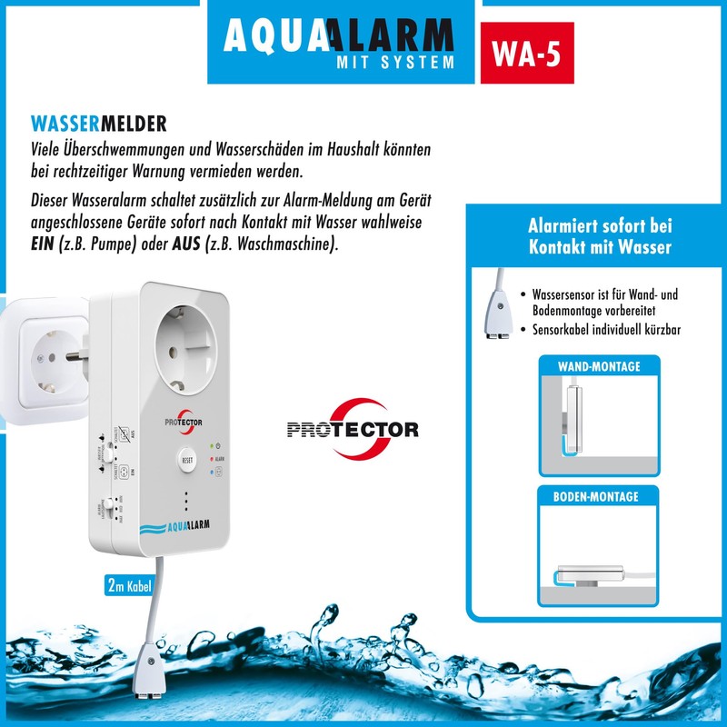 - Many expensive household floods could be avoided if warned in time. In addition to the alarm message, this water alarm switches devices connected to the device immediately after contact with water optionally on or off:
