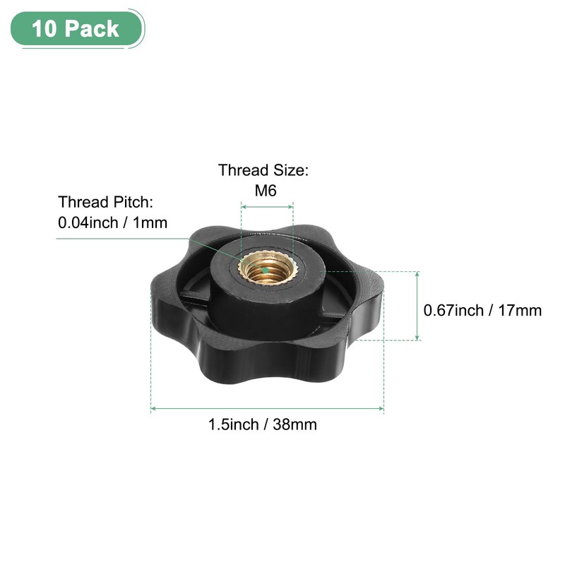- [Size & Package] - Type: Female Thread Blind Hole; Thread Size: M6; Thread Pitch: 1 mm/ 0.04 inch; Head Width: 38 mm/ 1.5 inch; Total Height: 17 mm/ 0.67 inch; Package Includes: 10Pcs x Star Head Screw Clamping Knobs