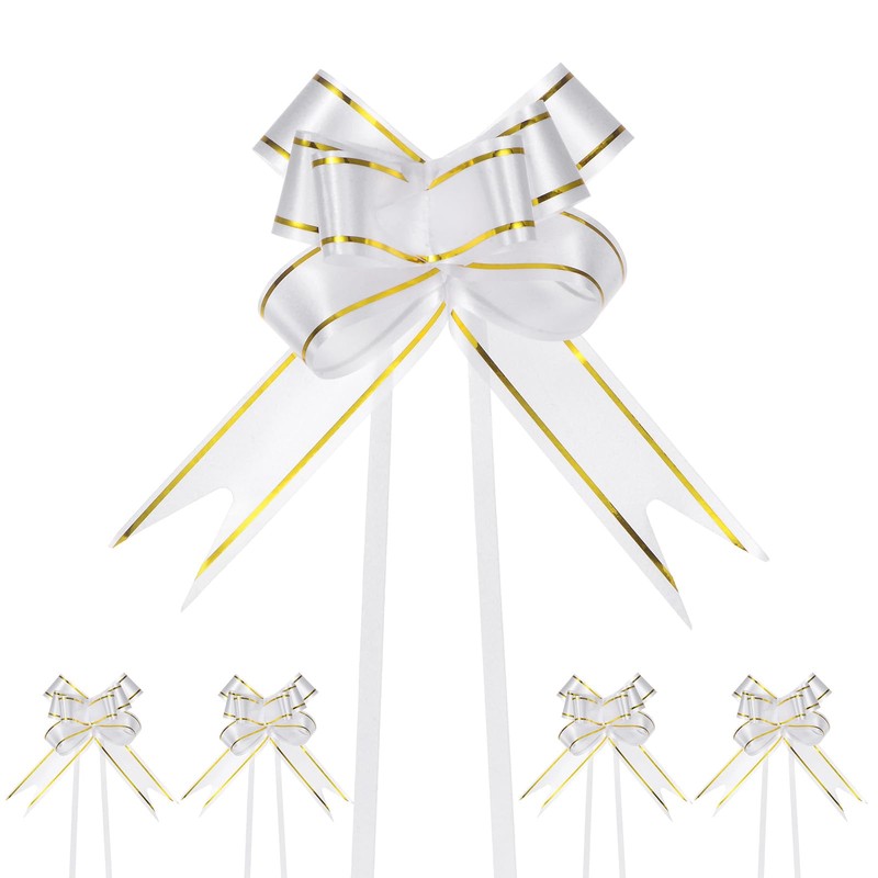 M METERXITY 100-Pack Ribbon Pull Bows, 3.74 Inch / 9.5cm Plastic Gold Edge Ribbon Bows for Gift Wrapping/Wedding/Flowers/Baskets Decorations, Satin Pull Bows [White Gift Bow]