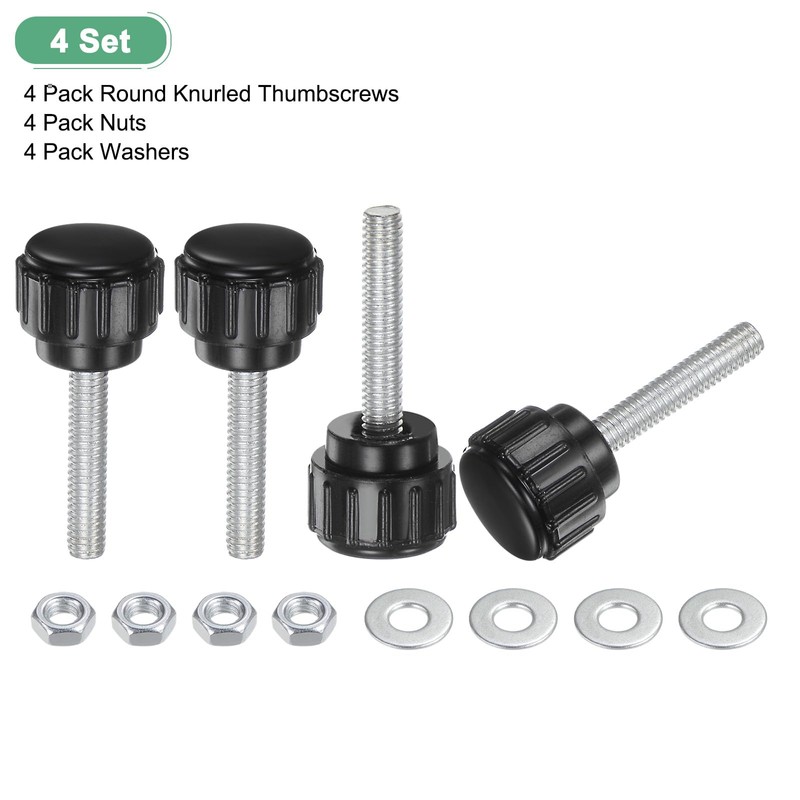 - [Size & Package] - Thread Size: M4; Thread Pitch: 0.7 mm/ 0.03 inch; Thread Length: 20 mm/ 0.79 inch; Head Width: 14 mm/ 0.55 inch; Total Length: 32 mm/ 1.26 inch; Package Includes: 4Pcs x Round Knurled Thumbscrews; 4Pcs x Nuts; 4Pcs x Washers