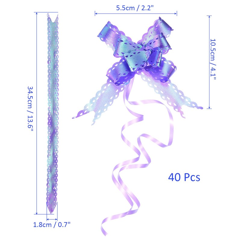 40 Pack of Sparkling Pull Bows, which size is 10.5 x 5.5 cm / 4.1 x 2.2 inch (L*W) and its dimensions before pulling is 34.5 x 1.8 cm / 13.6 x 0.7 inch (L*W)