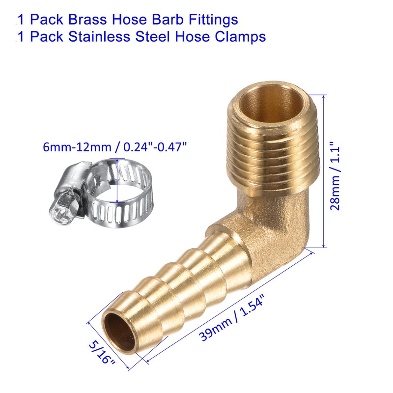 1 Pack Brass Hose Barb Fittings, 1 Pack Stainless Steel Hose Clamps, which thread size is 1/4NPT Male, barb outer diameter: 5/16 inch, and overall size is 35x28x13mm / 1.38x1.1x0.51 inch (L*W*H).