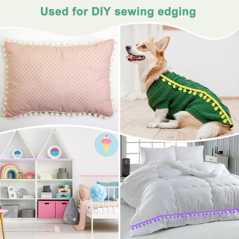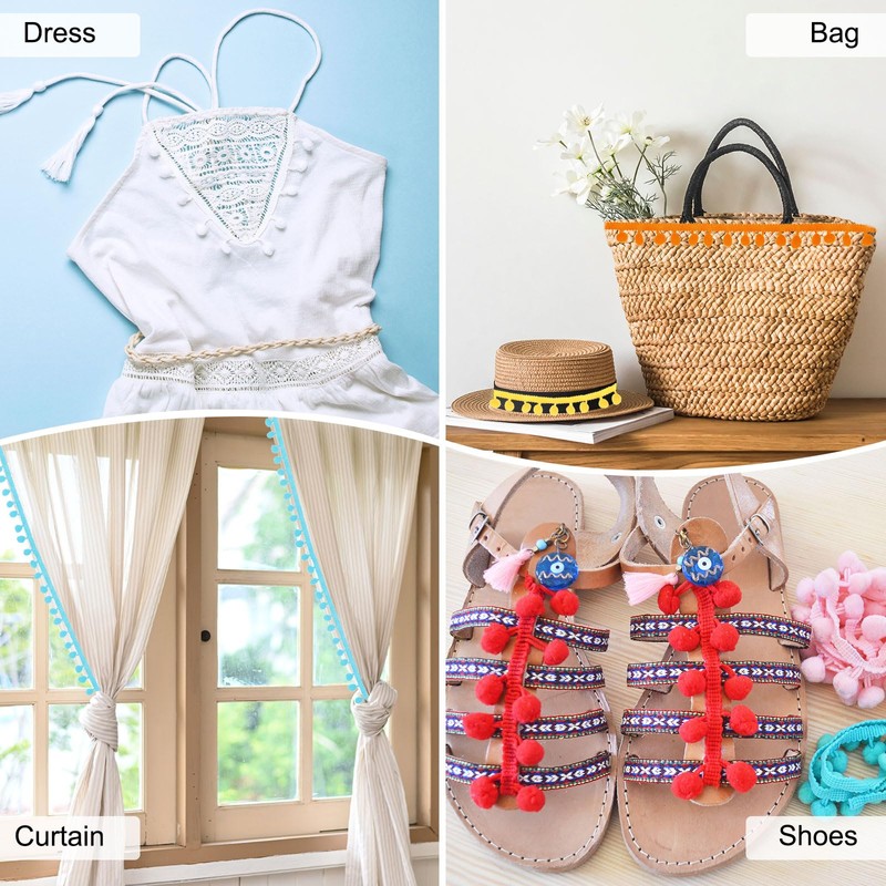 - [Multipurpose Use] - The pom pom trim ribbon is suitable for edge decoration of textiles, such as curtains, sofa covers, pillows, or the edges of furniture like bedside tables, cabinet doors, or table corners. It is not only suitable for accessories such as hat edges, cuffs, and scarves but can also be used to make DIY crafts, like bags, lanterns, balloons, etc.