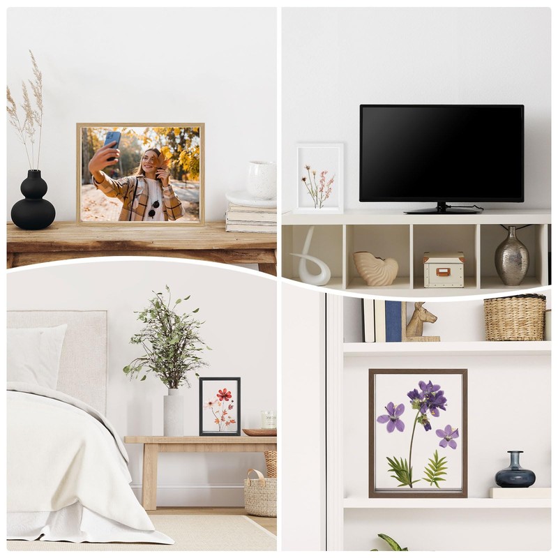 - [Functional Design] - The double acrylic photo frame features a modern design that showcases dried flowers between two transparent panels, creating a stunning floating effect. The wooden frame adds a rustic charm, complementing the delicate beauty of pressed flowers and adding an elegant touch to your decor