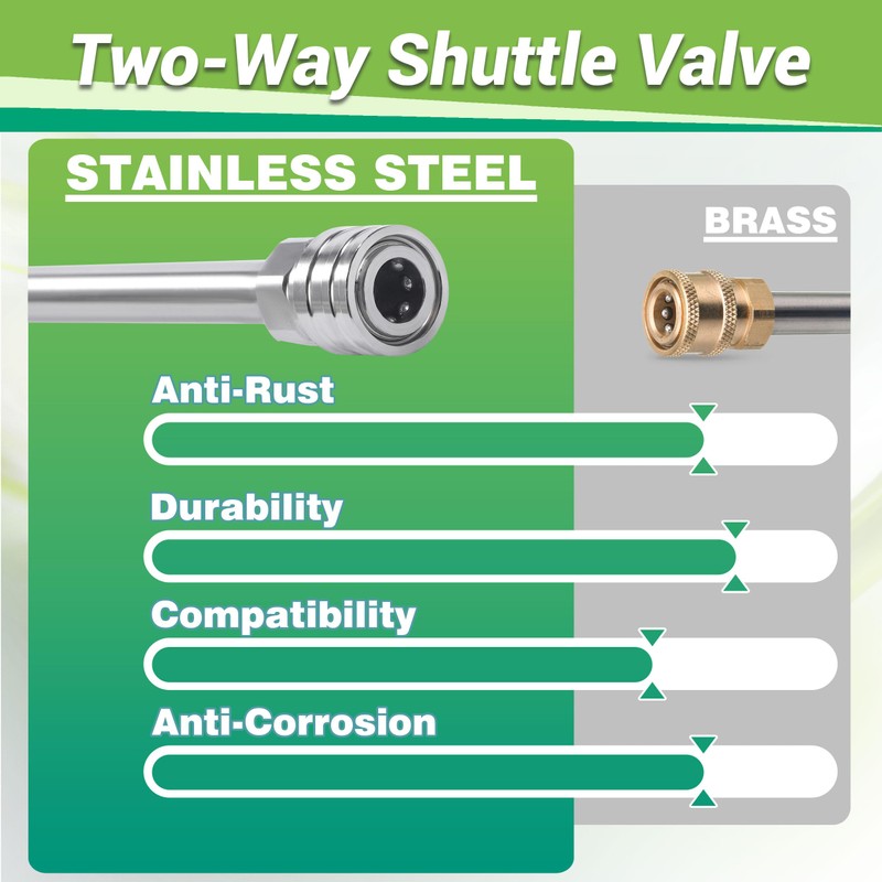 - Doble extremo: varita de lavado a presión de doble lanza con un diseño único: un extremo para la boquilla de lavado eléctrico y el otro para el cañón de espuma de nieve. Ahorra tiempo y esfuerzo cambiando fácilmente entre la limpieza de espuma y agua con una válvula de lanzadera bidireccional, por lo que es una opción ideal para tareas de limpieza eficientes.