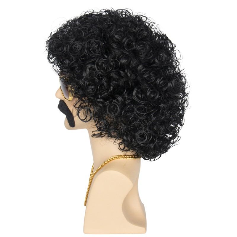 - Package include: 1*70s 80s Disco Rock Wig, 1*Gold Necklace, 1*Glasses, 1*Black Mustache, 1*Wig cap.
