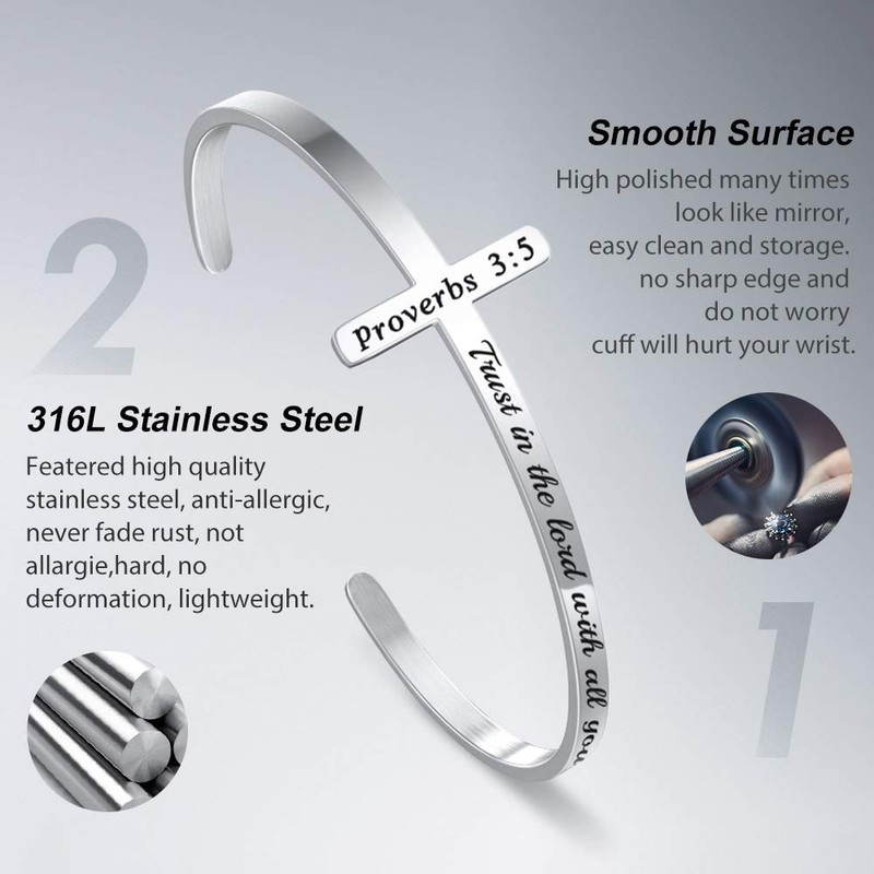 - MATERIAL: Christian gifts cross bracelet, premium 316L stainless steel. High polished and oxidation resistant, bright and shinny, never rust or get tarnished. Nickel free and hypoallergenic cuff bracelet is strong and durable for daily wear.