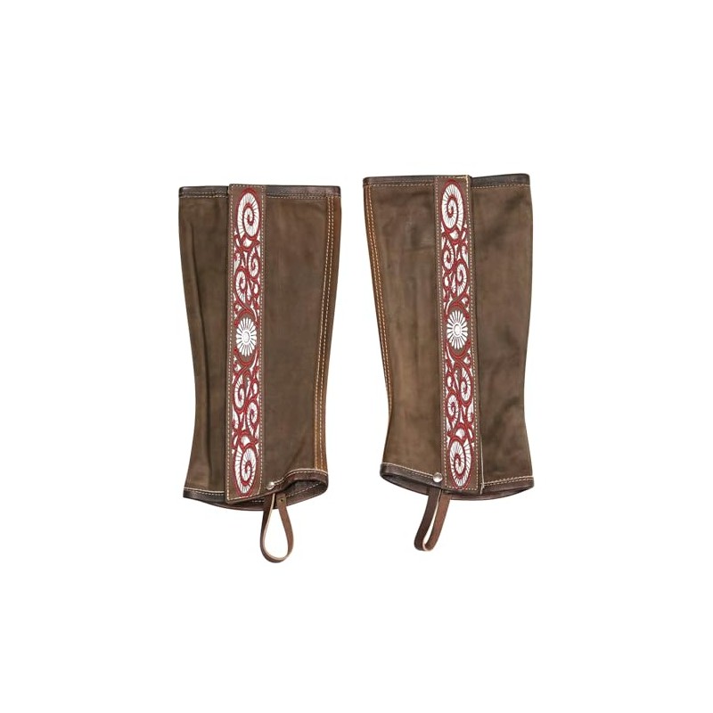 Soft Leather leggings featuring Velcro closures with beautiful custom design. Very comfortable and easy to take on and off, adjustable. Made in Mexico.Polainas de gamuza con cierres de velcro con diseno al lado. Muy cómodo y fácil de poner y quitar.Measurements:Length(largo): 16"Width: Adjustable (16"-18")
