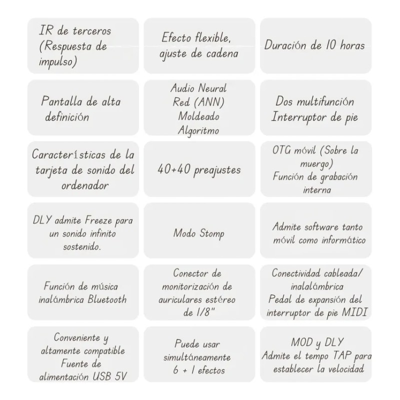 6 módulos simultáneos: Noise Gate, Boost, Compresor, 20 simulaciones de cabezales (15 guitarra + 5 bajo), EQ 3 bandas.