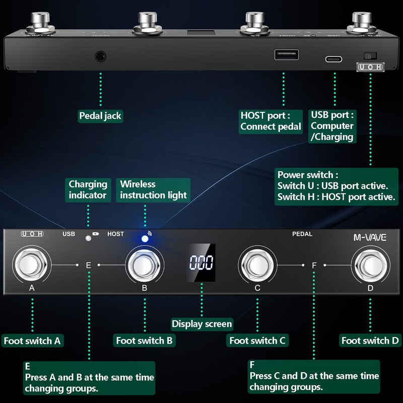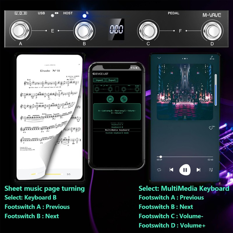 - Wireless Connectivity: This BT MIDI foot controller allows for wireless operation and control of music apps via BT wireless connectivity.Can be used on multiple platforms including WINDOWS, MAC, IOS, and ANDROID.Can use the foot switch to switch the preset control effect switch and other light functions.MIDI support information: PC, CC, NOTE ON/OFF, SYSEX.