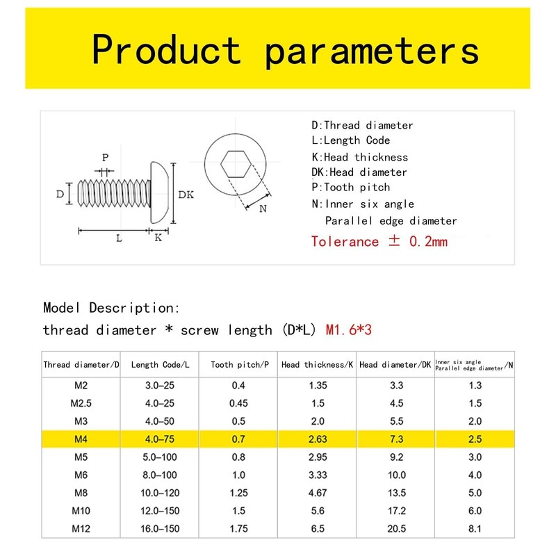 - Thread Diameter 4mm; Thread Pitch: 0.7mm; Screw Length: 140mm.