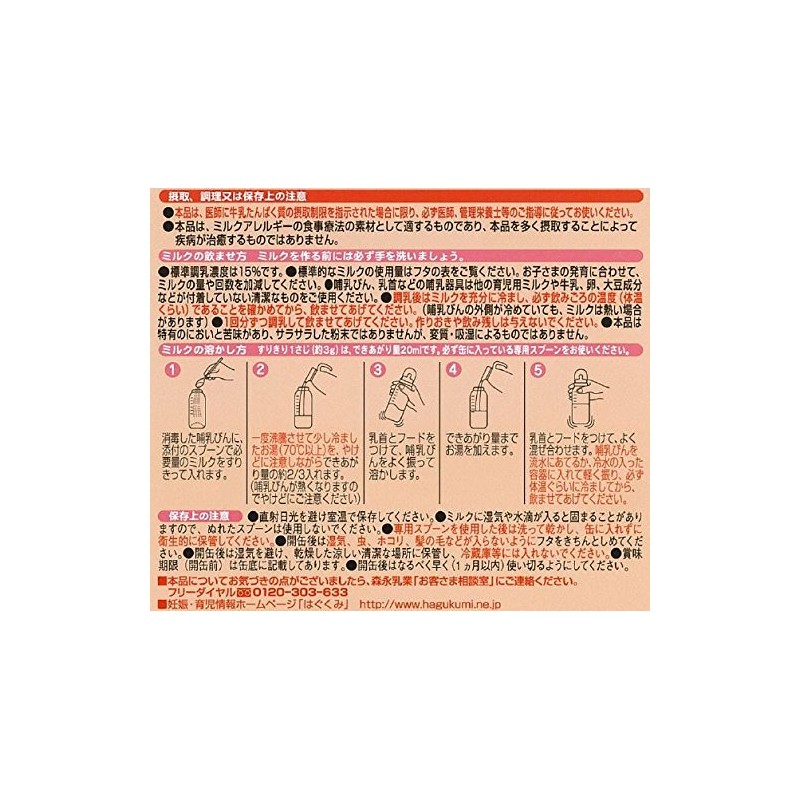 - 育児用ミルク、牛乳などを与えて下痢や湿疹などの症状が出る乳幼児にお使いいただけます。(ミルクアレルゲン除去食品)