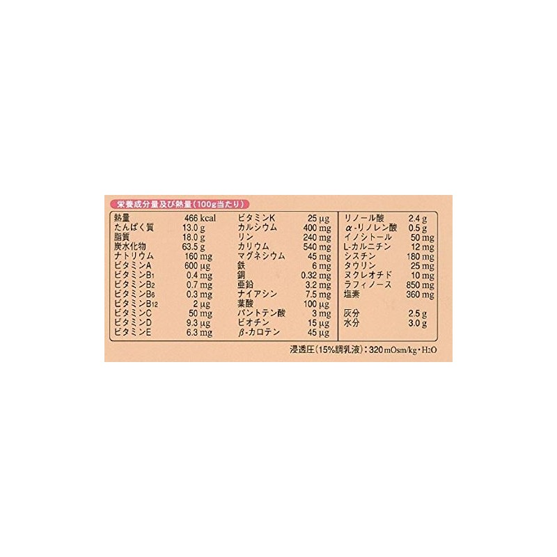 - 原材料:でんぷん分解物、調整脂肪(パーム油、パーム核油、ヒマワリ油、サフラワー油、エゴマ油)、乳たんぱく質(カゼイン)消化物、ショ糖、ラフィノース、L-カルニチン/塩化カルシウム、グリセリン脂肪酸エステル、クエン酸三ナトリウム、水酸化カルシウム、塩化マグネシウム、炭酸カルシウム、L-シスチン、L-チロシン、ビタミンC、L-トリプトファン、水酸化カリウム、イノシトール、水酸化ナトリウム、硫酸第一鉄、タウリン、硫酸亜鉛、ニコチン酸アミド、シチジル酸ナトリウム、ビタミンE、パントテン酸カルシウム、ウリジル酸ナトリウム、ビタミンA、硫酸銅、ビタミンB2、5'-アデニル酸、イノシン酸ナトリウム、グアニル酸ナトリウム、ビタミンB1、ビタミンB6、葉酸、β-カロテン、ビオチン、ビタミンD3、ビタミンB12