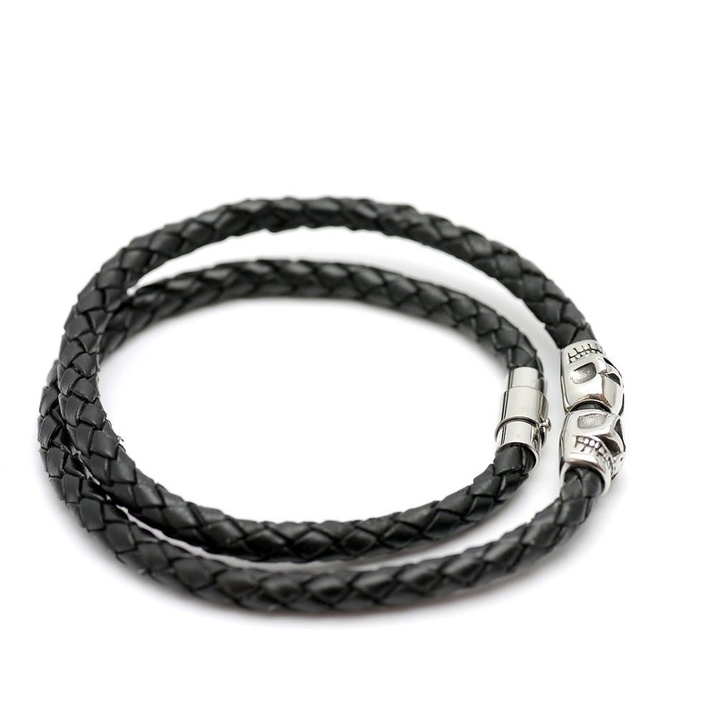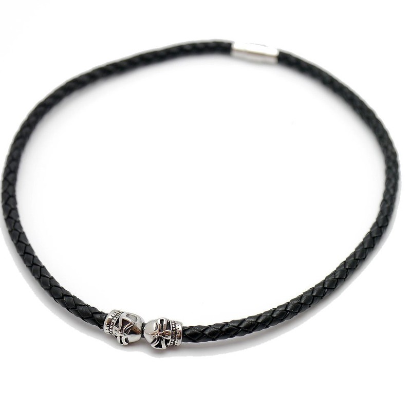 - Product Description: 2 point choker made of genuine leather. Hard double skull design; The top can be moved freely so you can arrange it as you like. The clasp is made of stainless steel material that is convenient and gentle on the skin