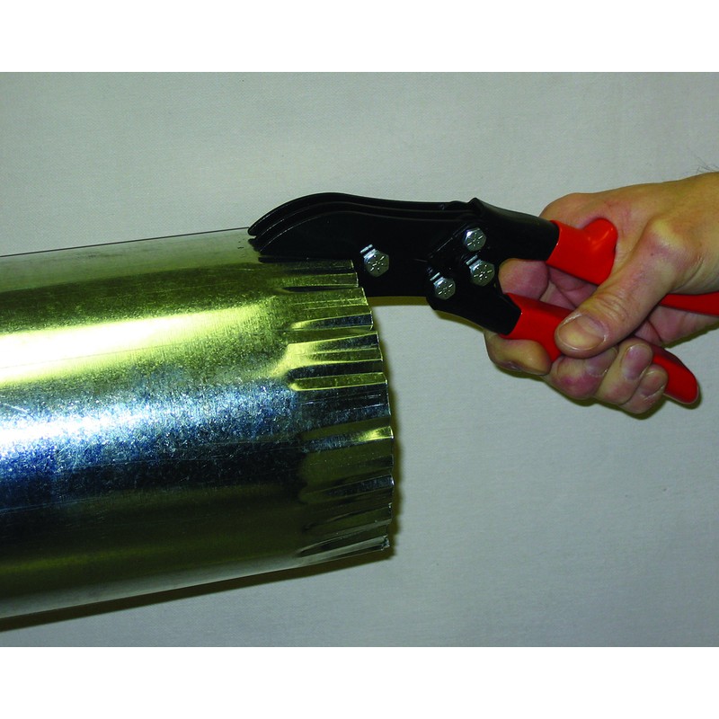 Redesigned -- now available in straight and ergonomic, angled, offset models Ideal for reducing diameter of round duct, sheet metal pipe, and downspouts for insertion into other pipes Five blades make uniform crimps on sheet metal up to 20 gauge. Recommended for light or heavy piping -- furnace, smoke, wall stacks, air ducts, water heater vent pipes, and downspouts Crimps up to 1-5/8" back from end for good overlap connection Heat treated blades for longer wear, hardened pivot bolt for durability, and vinyl grips for comfort For natural indraw on metal, always start with the three blades on top.
