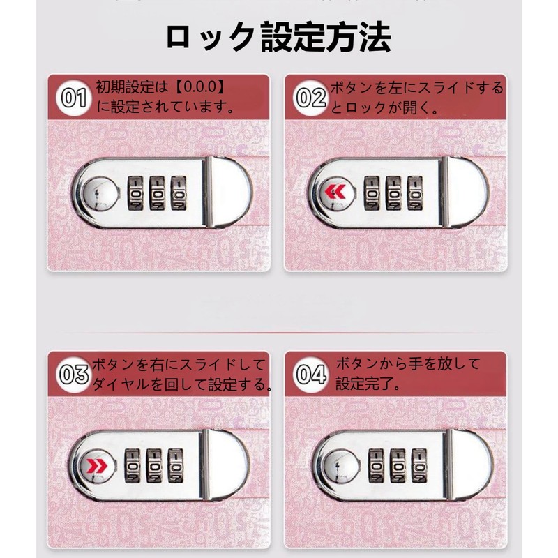 - Lock Setting Method: The default setting is set to [000]. While you slide the button to the right, select the 3 digit number and turn the dial to set it. Release the button to complete the setting