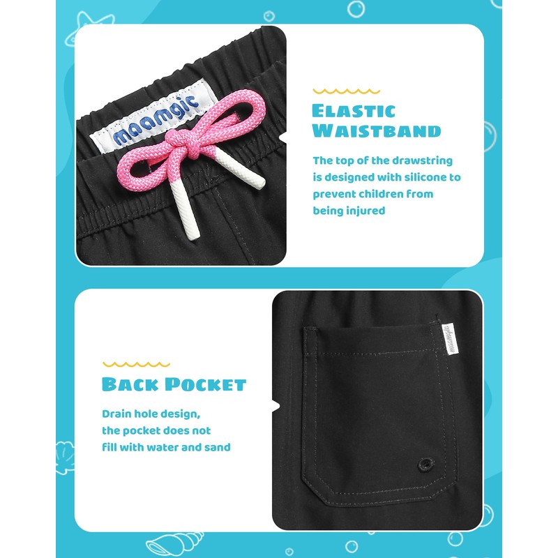 - Feature: These boy swim trunks feature elastic waistband with drawstring and silky compression liner. Two front pockets with mesh interior and one back pocket with nicely embroidered grommet to let water drain.