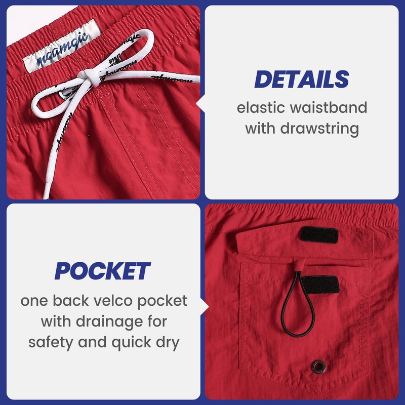 • This type of board shorts all have three pockets, two lining pockets beside and one velcro pocket on the back with drainage. Thoughtful design wiht a rubber band inside the back pocket and a small velcro pocket inside the front of swim trunk which will keep your property safe and leave your hands free when you wear it.