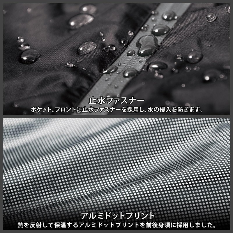 - Feature 2: Fleece on the head and collar + additional padding to keep you warm. The sleeves are quilted to allow arms to pass through, and the aluminum dot print is applied on the front and back body that reflects heat and keeps you warm. For the neck, wrists, and lower abdomen where cold air can enter easily, increasing the seal. The action cut does not feel bulky, even when you raise your arms and does not interfere with movement. The pockets are made with a waterproof zipper on the front, and the inside pocket protects valuables from rain and dirt
