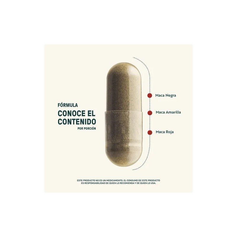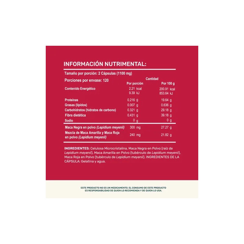 COMPOSICIÓN PRINCIPAL: LIFE360+ Maca Mix suplemento alimenticio en cápsulas contiene Celulosa Microcristalina, Maca Negra, Maca amarilla y Maca Roja en polvo (raíz de Lepedium meyenii) como ingredientes principales dentro de su formulación.