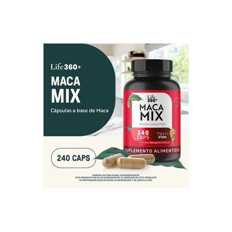 PRESENTACIÓN: LIFE360+ Maca Mix es un suplemento alimenticio en cápsulas a base de maca (amarilla, roja y negra) que se encuentra disponible en presentación de envase de tarro de plástico con un contenido neto de 240 cápsulas por envase.