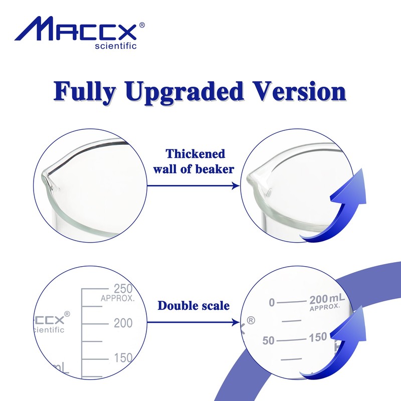 Maccx Maccx 8.5oz(250ml) Sturdy Glass Beaker, Heavy-Duty Lab Beaker Set, 3.3 Borosilicate Griffin Low Form with Printed Graduation, Pack of 6, BKL250-006