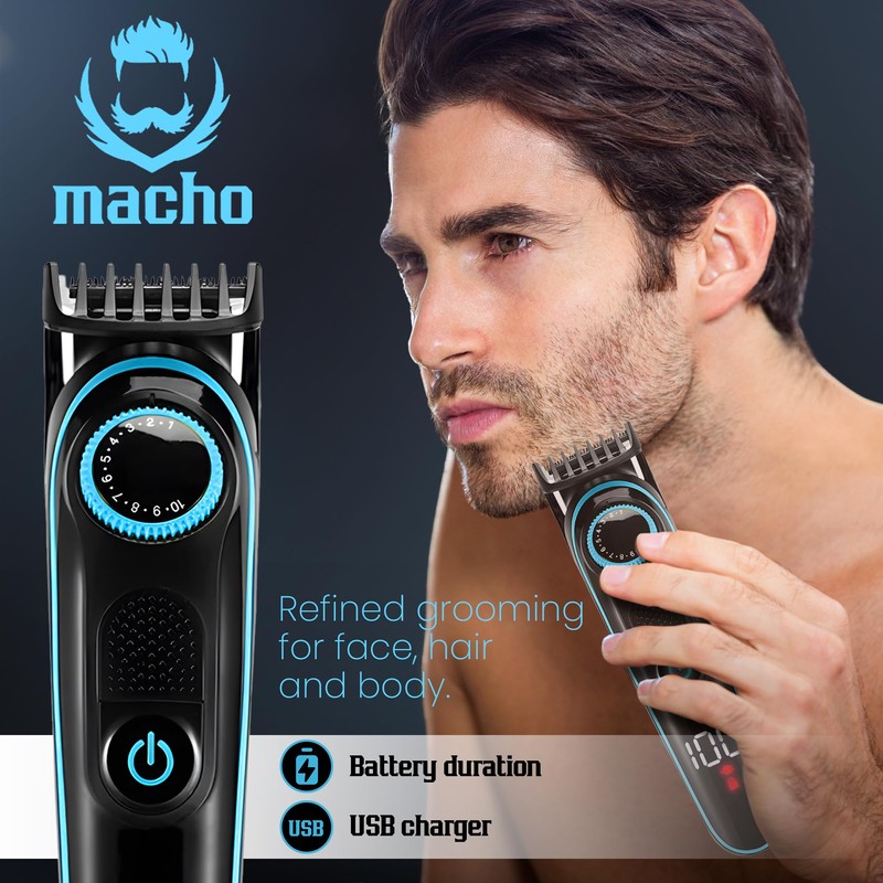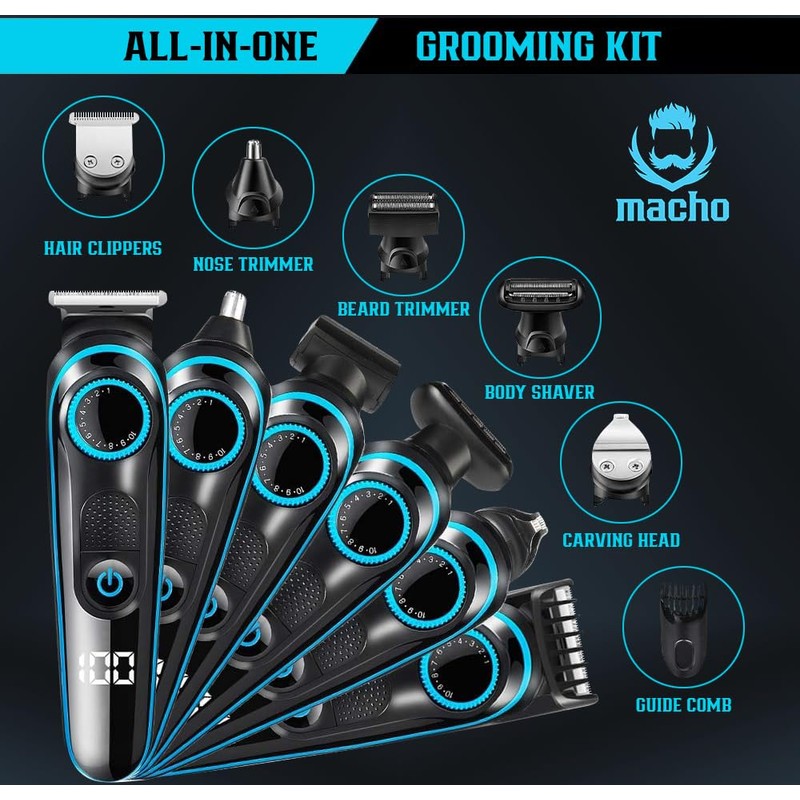 MACHO 5 in 1 Grooming Kit - Hair Trimmer Beard Trimmer Body Trimmer, Hair Clipper, Ear & Nose Hair Trimmer, Electric Razor, Shaver Cordless, Body Groomer With USB Rechargeable LED Display Black & Blue