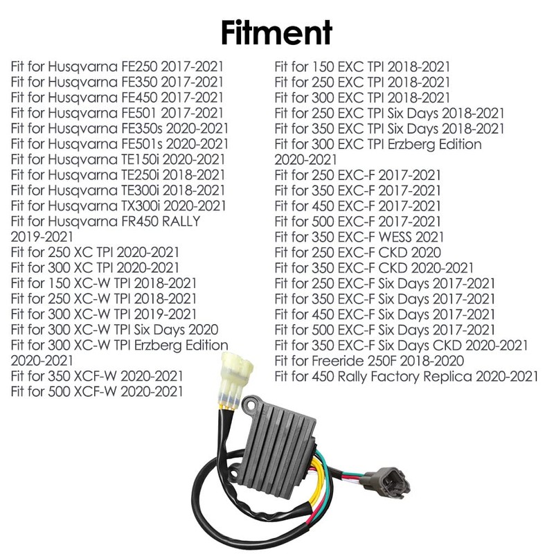 - Compatibility: This rectifier is compatible with Husqvarna FE250, FE350, FE450, FE501, FE350S, FE501S, TE150I, TE250I, TE300I, TX300I, FR450 etc. Please check whether your vehicle model is compatible before placing an order.