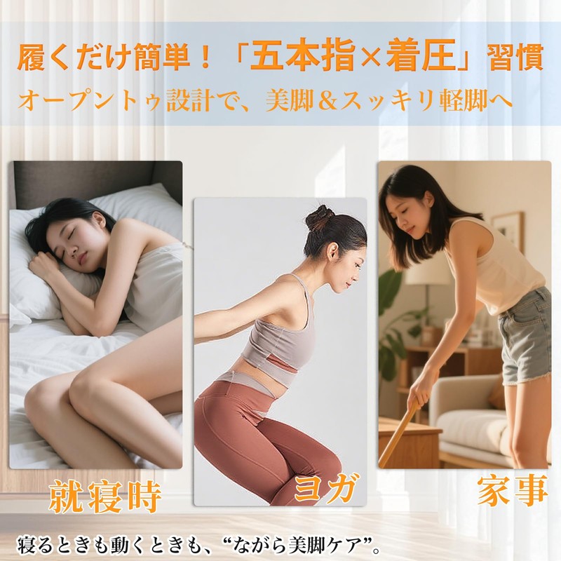 • 【足指リラックス・室内専用設計】靴は履けません。足指をしっかり広げる5本指オープン仕様で、外反母趾やむくみ対策にも◎。デスクワークや立ち仕事後の“疲れ脚”ケアに最適です。