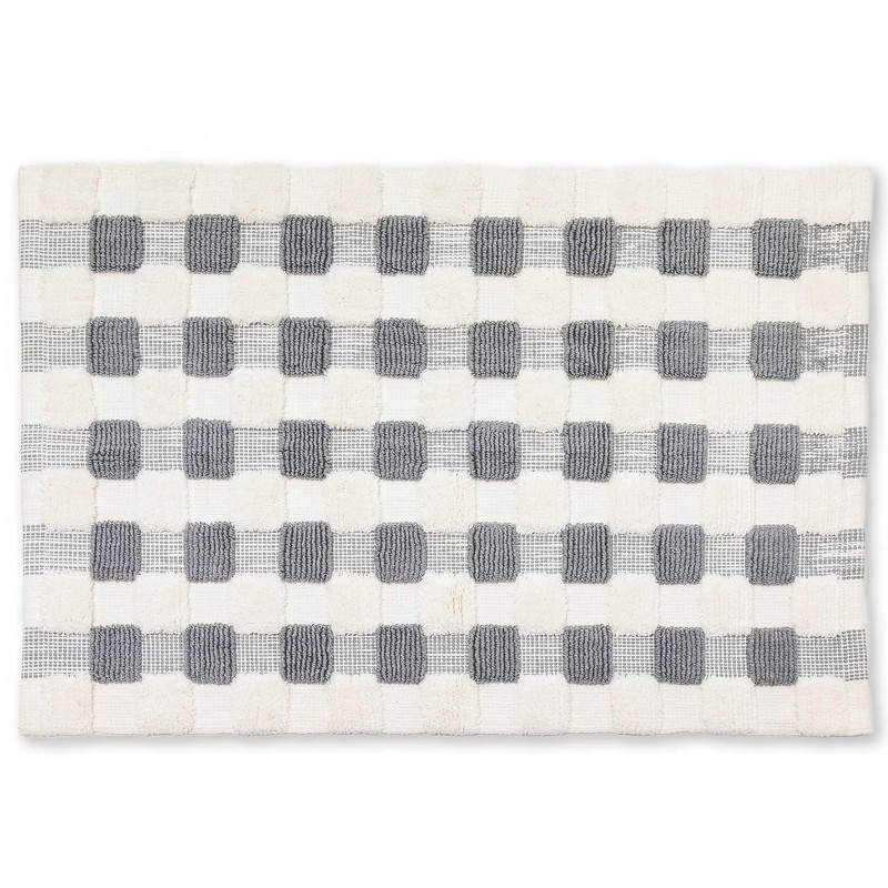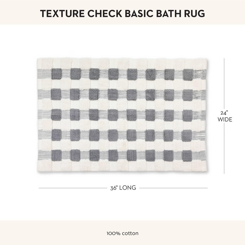 - FUN SHOWER & BATH DECOR: This luxury bath rug is woven with soft cotton for a thick, comfy feel. The Textured Check pattern bath mat mixes lower woven checks with higher looped and sheared checks. Melt into the cozy texture of this checkered gray-and-white bath rug after a long day.