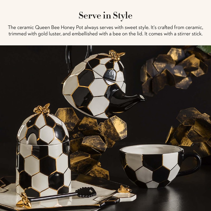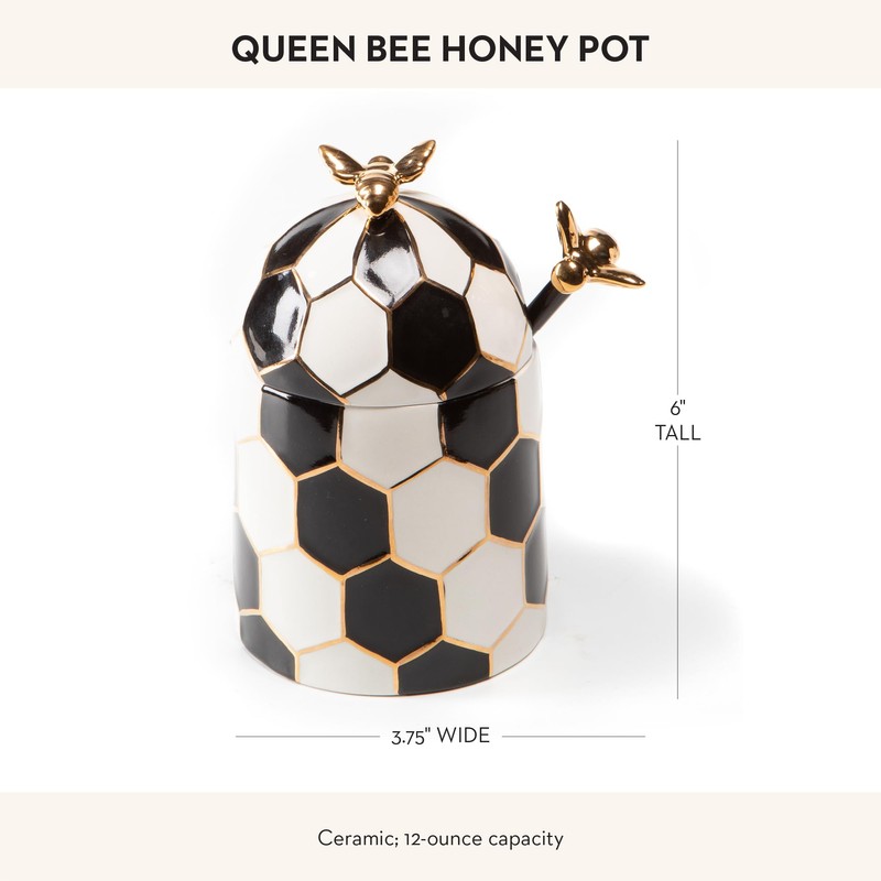 - ELEGANT KITCHEN ESSENTIALS: Our ceramic bee-hive honey dispenser brings sweet style to your table. Decorated in a modern black-and-white hive pattern, it’s trimmed with gold luster and embellished with buzz-worthy bees on the lid and on its honey dipper stir stick.