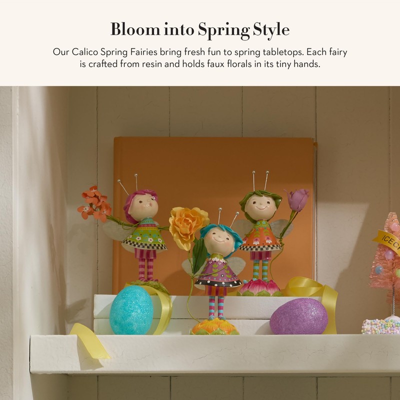 - ELEGANT SPRING DECOR: The Calico Spring Fairies set features a trio of fresh and fun hand-painted tiny fairies holding paper flowers and set on floral bases. These little miniature flower fairies are a lovely way to adorn for the season.