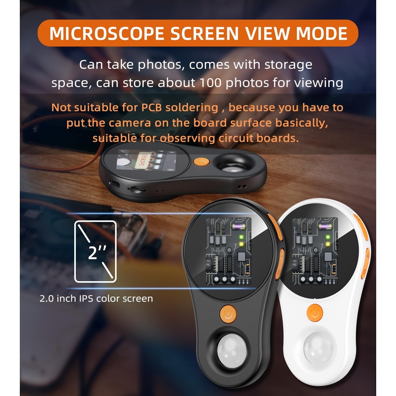 - Microscope screen observation mode: 2.0 inch IPS color screen, you could take photos, can be viewed in real-time, and comes with storage space, which can store about 100 photos for viewing (built-in photos cannot be downloaded, but can be deleted).