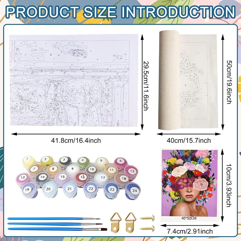 - Digital DIY oil painting set: suitable for all DIY hand-painted oil painting kit for beginners and adults. You will receive a 40 x 50 cm (16 x 20 inch) oil painting of a girl with flowers (unframed) with three brushes, including the required colours.