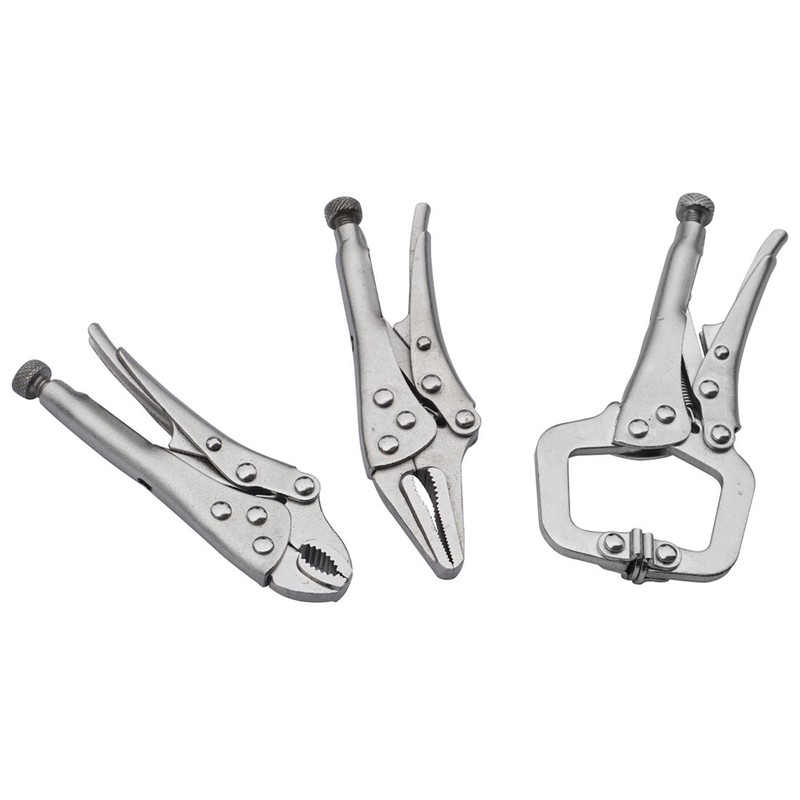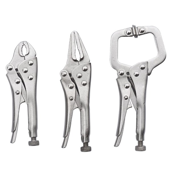 This 3pc mini locking pliers includes 4 in. curved jaw locking pliers, 5in. mini C-clamp pliers,5in. long nose locking pliers. Constructed of heat treated carbon steel with nickel plated to resist rust and corrosion. Ideal for using in small jobs that need clamping.