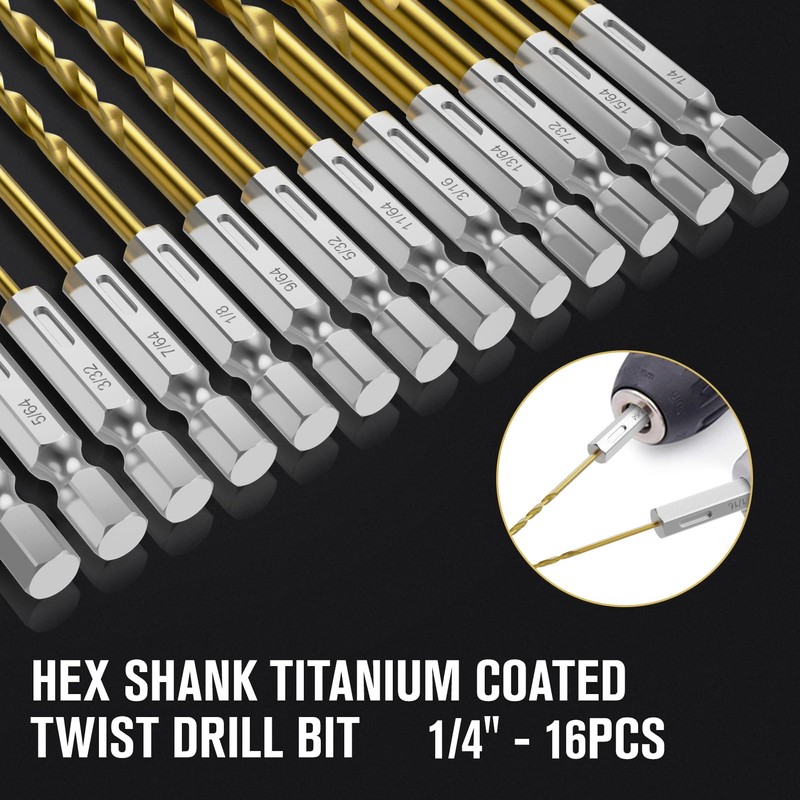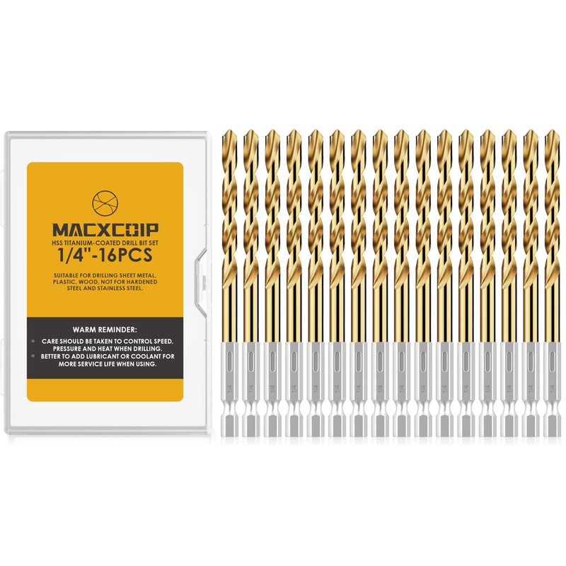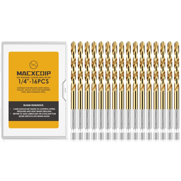 MACXCOIP Hex Shank Drill Bit Set, 16Pcs 1/4“ HSS Titanium Twist Drill Bit for Sheet Metal, Wood, Plastic, Quick Change Design