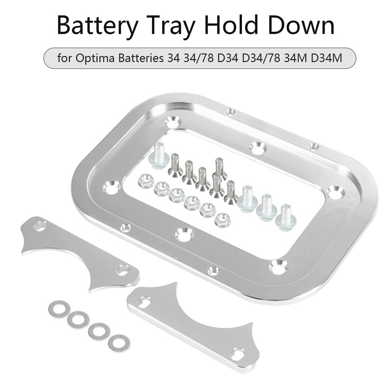 - Package included:1x battery tray;2x hold down tabs;4x 10mm bolts, ;6x 8mm bolts, ;4x bolt washers, ;6x nuts