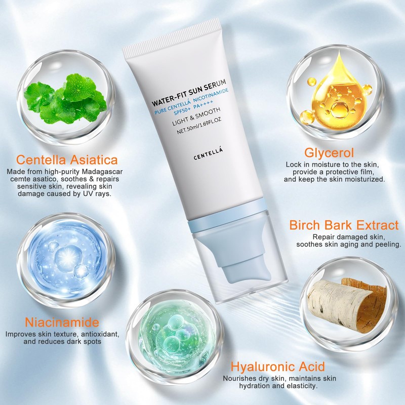 - 【Moisturizing And Moisture Locking】Water-fit sunscreen serum is infused with hydrating ingredients and absorbs quickly without feeling heavy on skin. It effectively moisturizes the skin and prevents moisture loss. SPF 50 face moisturiser can be easily layered with makeup or other skin care products to achieve the realm of sun protection without drying out the skin.