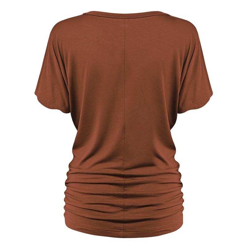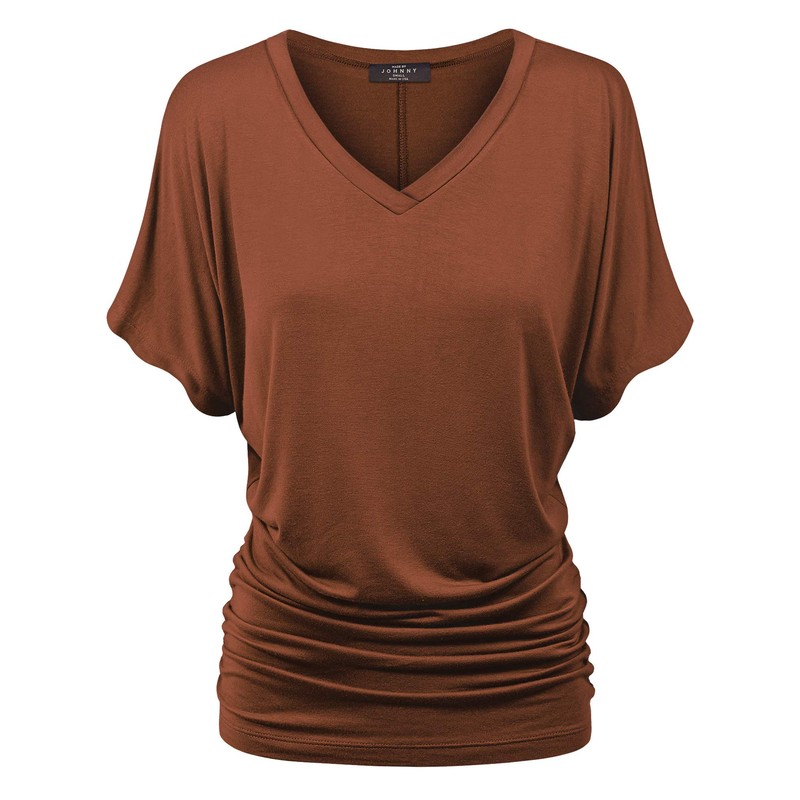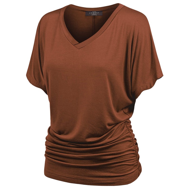 Made By Johnny MBJ WT1037 V Neck Short Sleeve Dolman Top with Side Shirring S Rust