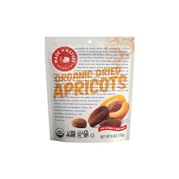 Certified Organic. Tree Ripened. Tremendous care and skill are used to grow our crops the old-fashioned way. Organic farmers utilize natural materials that build rich fertile soil. Made In Nature is pleased to bring you delicious, certified organic Dried Apricots with all the flavor and nutrition that Mother Nature intended. Resealable package.