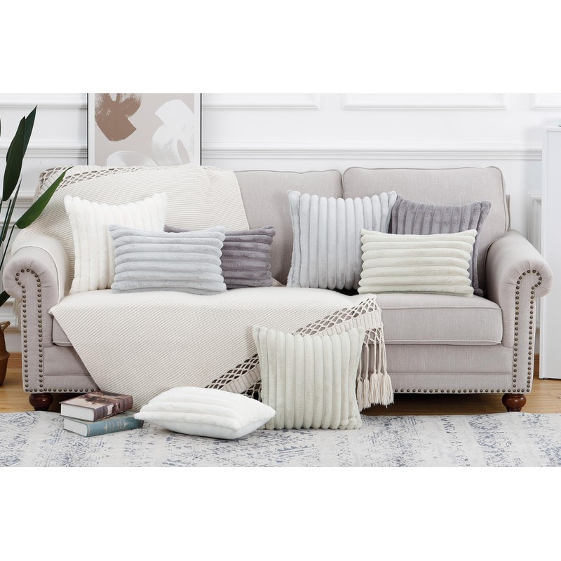 Madizz Set of 2 Faux Fur Plush Decorative Throw Pillow Covers 12x20 inch, 30x50 cm, Grey Fluffy Striped Soft Decorative Cushion Cover for Sofa Bedroom Pillow Shell