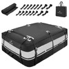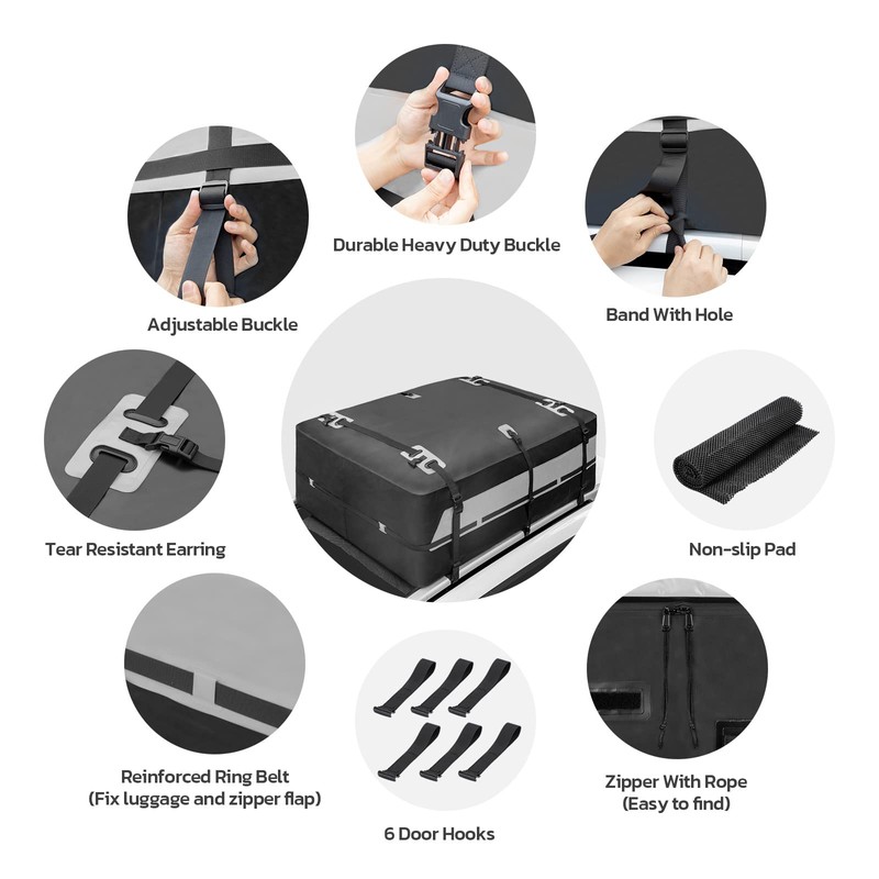 - LARGE CAPACITY: 15 cubic feet Maelstrom roof rack cargo carrier ( 45.67*33.86*16.93”) is designed to solve the problem of limited storage space in the car. This vehicle cargo carrier allows you to hold 3-5 suitcases,tents, sleeping bags and so on. This car roof bag comes with 1 non-slip mat,10 buckle straps, 6 door hooks,1 lock and 1 storage bag.