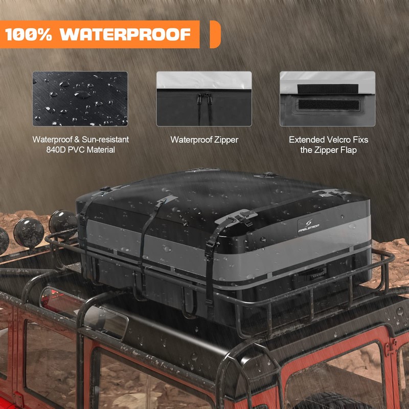 - 840D HIGH QUALITY MATERIAL: Made of wear-resistant, waterproof and sunscreen 840D PVC fabric. Maelstrom rooftop cargo carrier can protect your items from any damage and wetness in extreme weather like rainstorm. Maelstrom rooftop cargo carrier can protect your items from any damage and wetness in extreme weather like rainstorm.