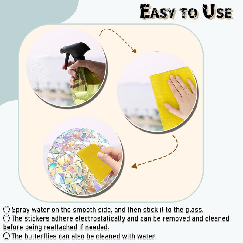 - EASY INSTALLATION AND REMOVAL Tear off the suncatcher sticker along the dashed line, spray the smooth side with water, and then stick it to the glass. The stickers adhere electrostatically and can be removed and cleaned if necessary before being reapplied. The butterflies can also be cleaned with water.