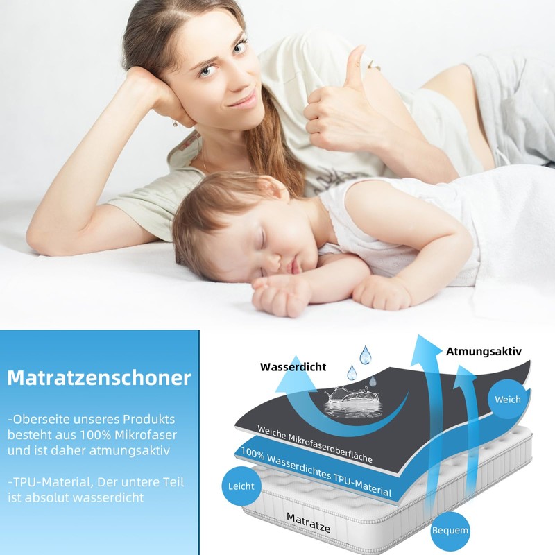 - 100% waterproof mattress protector: the mattress topper made of microfibre and waterproof film provides your mattress with reliable protection against liquids, sweat and mites and ensures a longer life of the mattress and increased sleeping comfort.