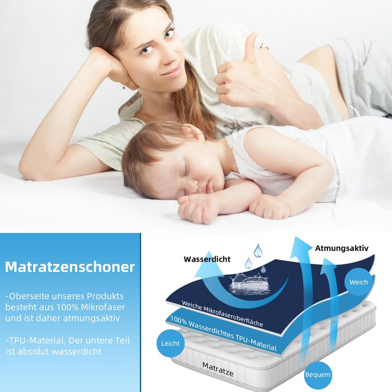 - 100% waterproof mattress protector: the mattress topper made of microfibre and waterproof film provides your mattress with reliable protection against liquids, sweat and mites and ensures a longer life of the mattress and increased sleeping comfort.