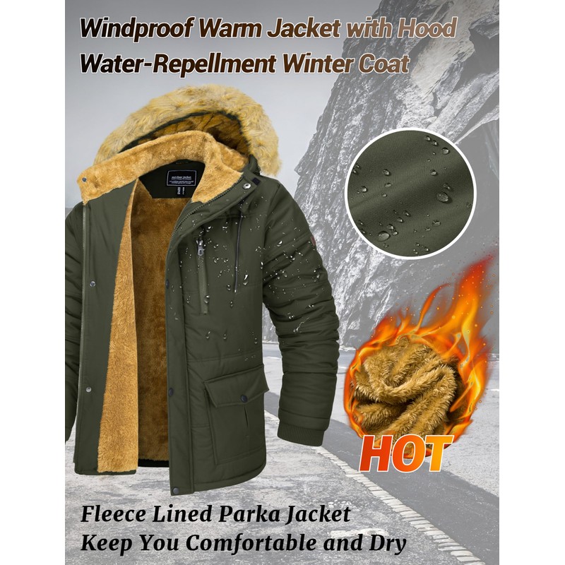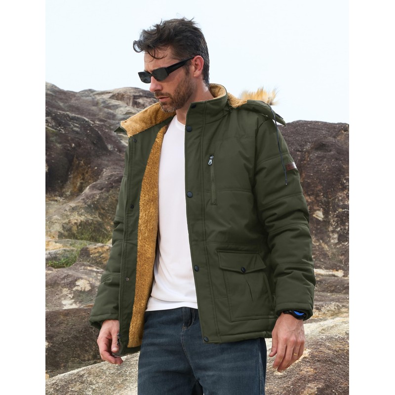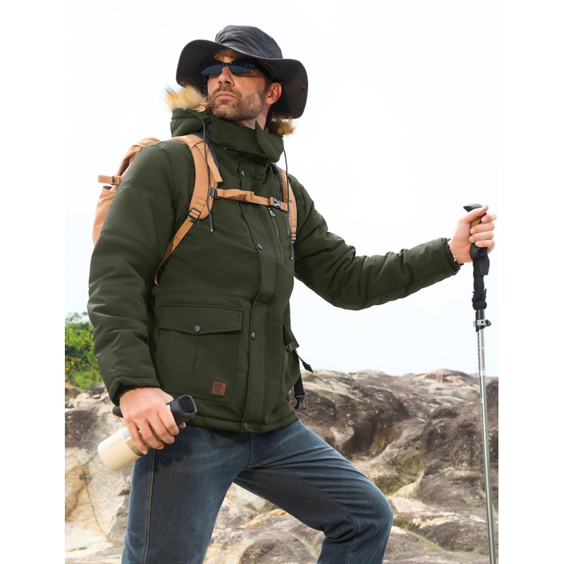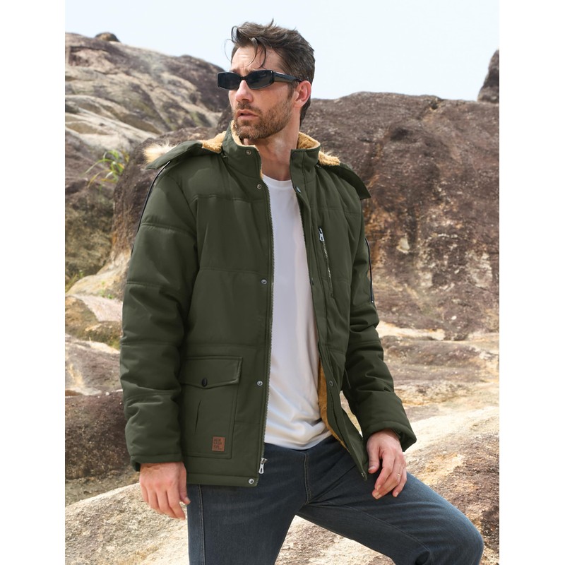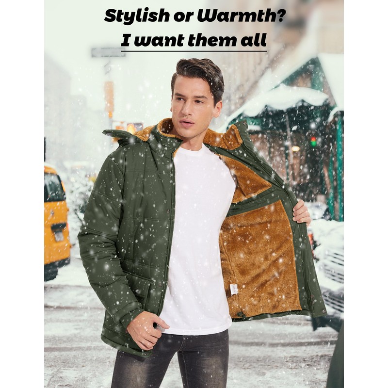 MAGCOMSEN Mens Jacket Winter Parka With Hood Thicken Warm Puffer Jacket Quilted Fur Fleece Lined Work Jacket Hiking Snow Jacket Army Green XL