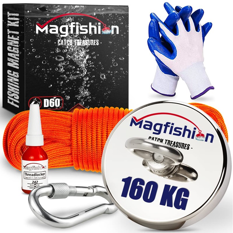 MAGFISHION Magnetic Fishing Set - 160 kg - Diameter 60 mm - Neodymium Magnet with Rope (20 m) and Gloves - Magnetic Fishing Angel - Eyelet Magnet - Fishing Magnetic Fishing Set