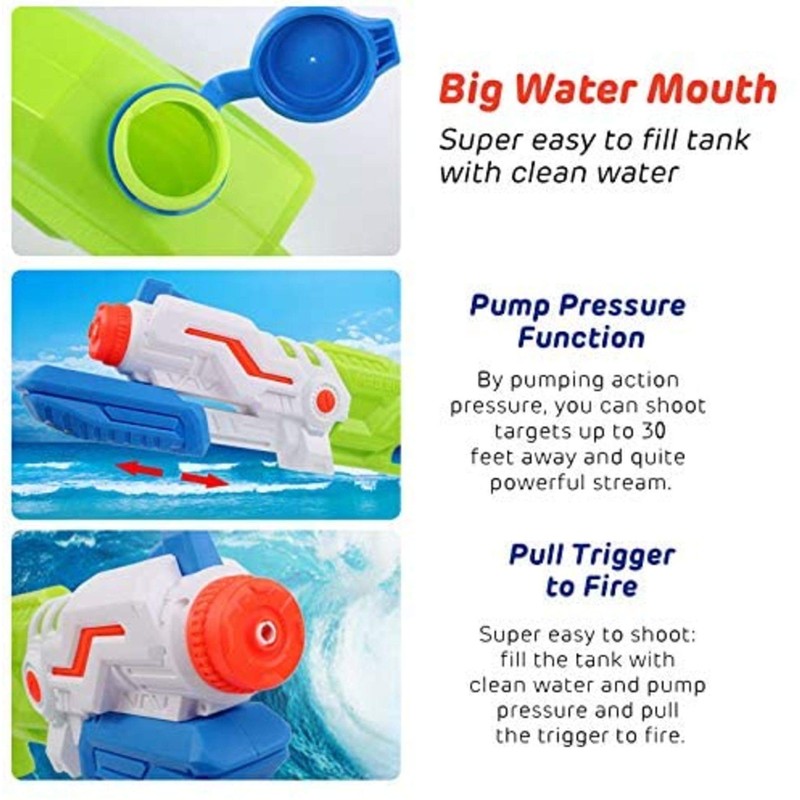 - HIGH CAPACITY BLAST: Our water blaster gun holds up to 1200cc of water, allowing you to drench your opponents with ease. The high-pressure pump design enables you to easily shoot water up to 30 feet, making it the perfect pool party toy or beach toy for kids for hot summer parties and outdoor playtime.