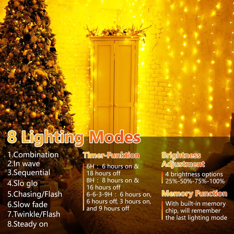 - Versatile Lighting Modes for Every Holiday Occasion: This string of lights offers 8 different lighting modes, including steady, twinkle, and fade, to suit any festive mood. From Christmas parties to family dinners, these lights can be adjusted with the remote control for ultimate convenience. Make your celebrations extra special with a touch of magical Christmas lighting.